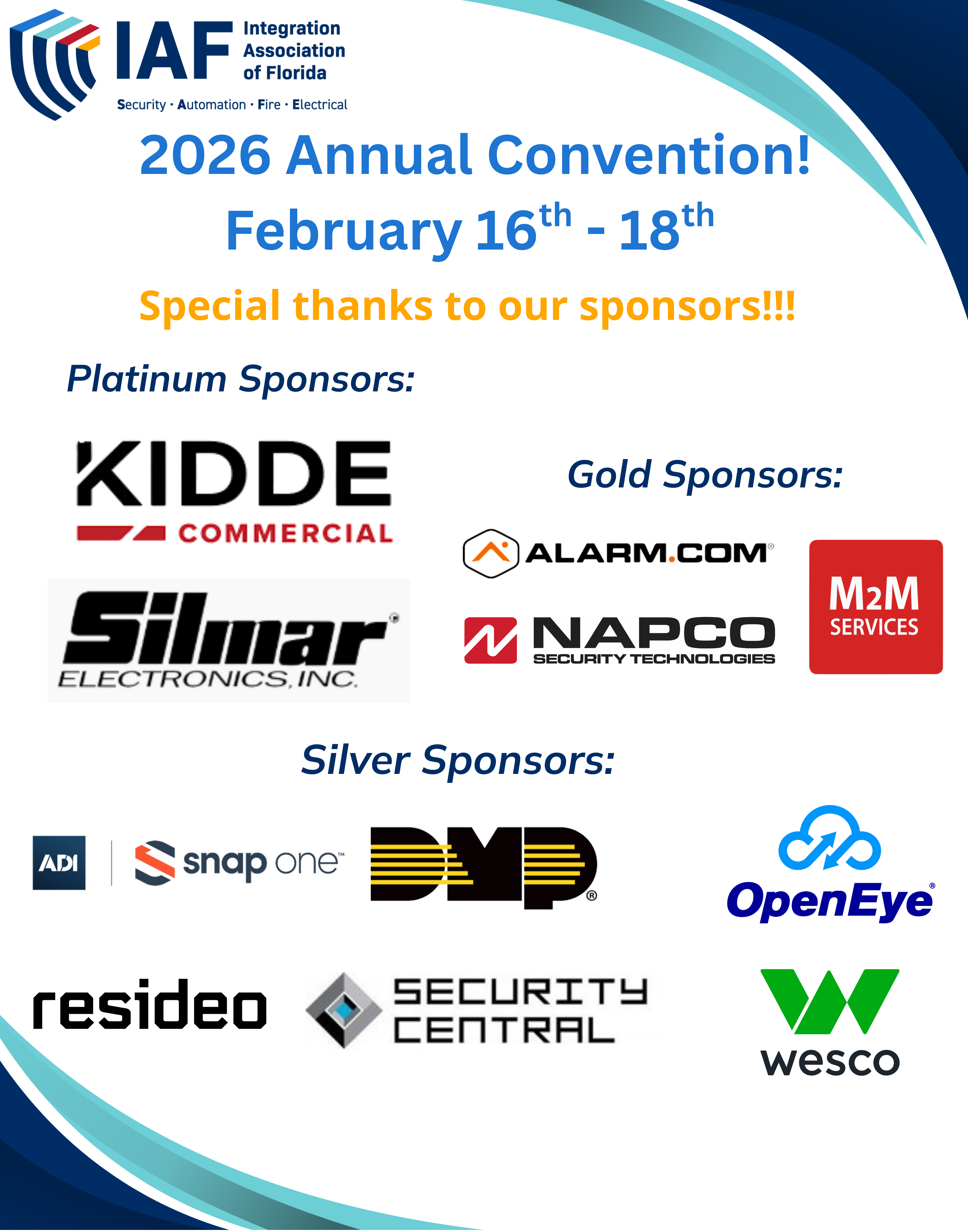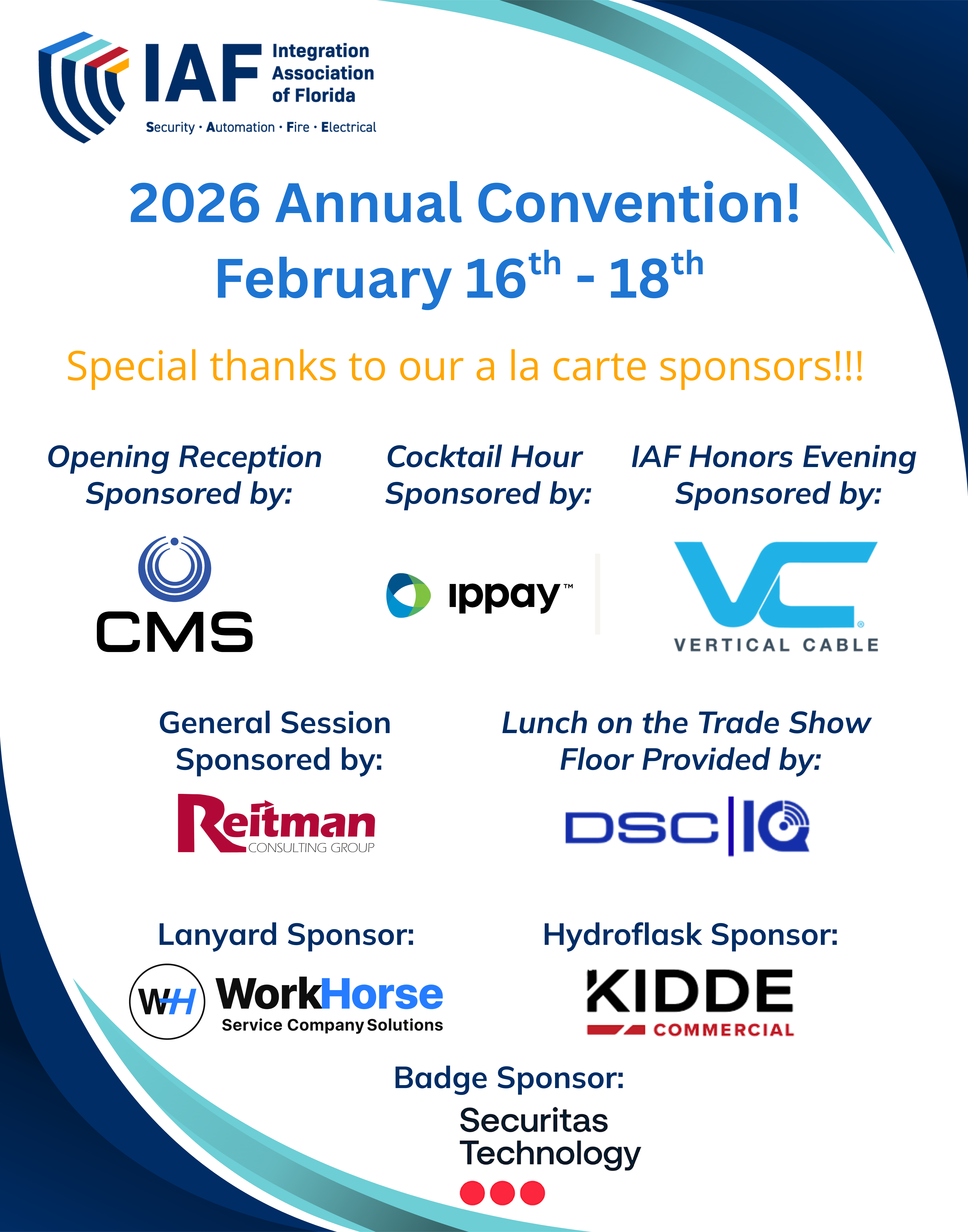 PLEASE NOTE: Registration is reserved strictly for Security, Automation, Fire, and Electrical Integration Companies. Manufacturers, Distributors and Service Provides must become a Sponsor or Exhibitor to Participate in the Annual Convention. For more information on available Sponsorships and Exhibit Space please contact Caroline Murphy at Caroline.Murphy@IAF-SAFE.org or at 252-876-8680.